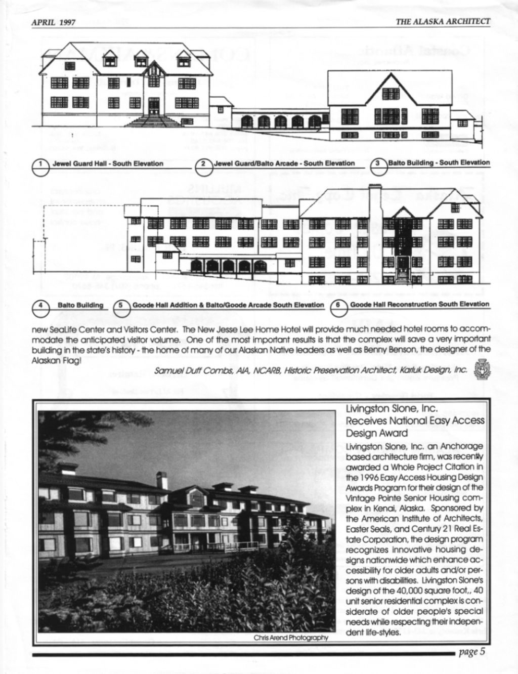 The Jesse Lee Home began construction in 1925 in Seward, Alaska. The Home originally began in Unalaska, Alaska on the Aleutian Chain and existed there until 1925 when the services were moved to Seward. It was established by the Woman’s Home Missionary Society of the Methodist Church. The two original buildings in Seward were the Jewel Guard Hall and the Goode Hall. Stanley Shaw, an architect of Tacoma, Washington State designed the two original buildings and they began construction in the spring of 1925 and were completed in the fall of the same year. In April 1927, Benny Benson, who lived at the home was notified that he had won the contest for designing the flag for the Territory of Alaska. Construction of a new building on the site began in August 1936 and was called the Balto Building after the famous lead sled dog Balto, who was one of the lead sled dogs for a team that participated in the serum run from Nenana to Nome to prevent a diphtheria epidemic in the winter of 1926. The home was temporarily closed in 1942 by the U.S. Army, because they were fearful that it would become a target in World War II. The home’s buildings were painted in tree camouflage due to their proximity to Fort Raymond, which had been established in 1942. The home reopened in 1946 and was to remain open until 1964 when the Methodist Women’s Home Missionary Society decided to close the Seward Home and move the services to Anchorage. The Goode Hall was determined to be too damaged in the quake of 1964, so it was torn down. Since the home services were relocated to Anchorage in 1966, the Methodist Church deeded the property to the City of Seward, who subsequently sold it to private owners. It has remained unoccupied for the last 38 years. The Jewel Guard Hall and Balto Building were placed on the National Register of Historic Places in 1995. The Goode Hall since it no longer existed was not part of the Register Nomination. The Jewel Guard Hall and Balto Buildings will have their southern facades restored to original appearance. The western, eastern, and northern facades will be restored, but will have modifications to existing elevations for life safety. Interior spaces and features in the Arcades and in many locations within the original buildings will be restored or in some cases reconstructed. The Goode Hall will be rebuilt to exemplify the original building on the southern facade, but will include an additional story to allow the required guestrooms for the hotel, which will be mainly housed in the Goode Hall and Goode Hall addition. As shown the building will expand to the north and include an inner atrium and west addition that will house additional guestrooms. The buildings are in relatively sound condition due to the removal of all interior finishes some time ago which allowed the structure to breathe and not to deteriorate as much as would have happened if the buildings would have been sealed. The total square footage of the existing buildings-Jewel Guard Hall and Balto Buildings and their accompanying arcades is approximately 35,856 square feet. The total for the Goode Hall Reconstruction & Addition is approximately 63,818 square feet. The total square footage of the combined facilities is 99,674 square feet. The total number of guestrooms shown in the existing plans is 155. Twenty-two guestrooms are in the Jewel Guard Hall and 133 are in the Goode Hall Reconstruction and Goode Hall Addition. The number of rooms may vary if the size of some of the rooms increases. The total square footage will most probably remain the same to keep the total square footage under 100,000 square feet. At $100 per square foot for both the renovation and the new buildings the cost would be approximately $9,967,400 not including the cost of the Architectural and Engineering Design Fees, existing facilities, land, and site improvements. Approximately 36 % of the total square footage is in the existing historical structures. https://en.wikipedia.org/wiki/Jesse_Lee_Home_for_Children